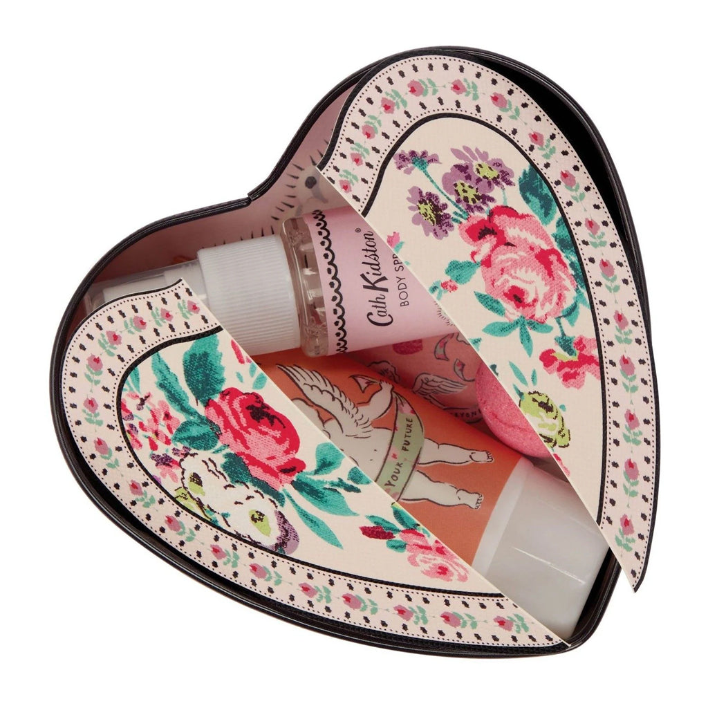 Discover the artistry of Kidston's hand-painted prints in the Wild Flowers Wild Women Collection, where frilly collars meet vintage stripes and bold archive florals. Cath Kidston details include a heart shaped insert with roses and cherubs inside the tin. The heart opens to reveal the treats inside.