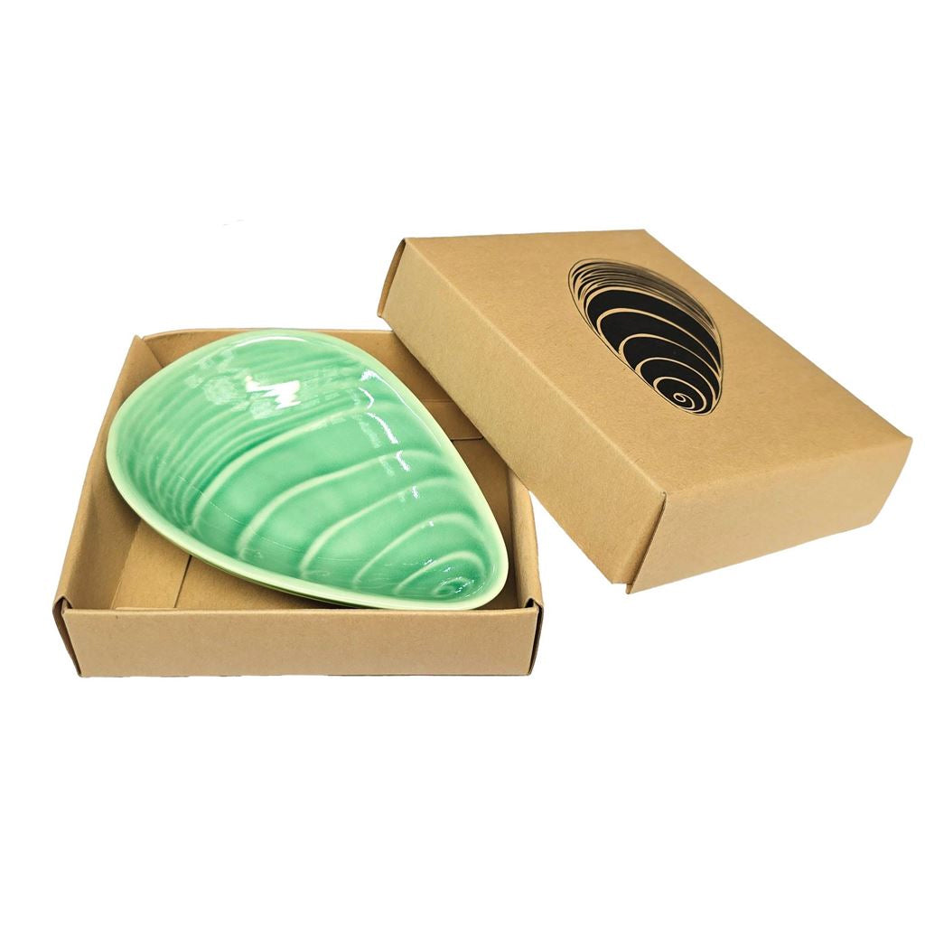 The Mussel series from Jo Luping features a textural relief design with a gloss clear glaze inside and outside.